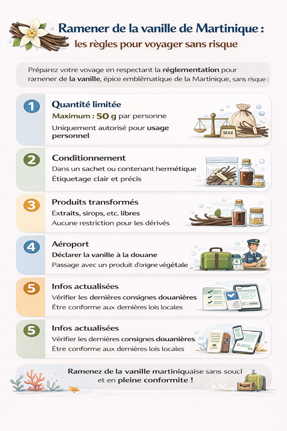 Ramener de la vanille de la Martinique, obligations douanières, documents, quantités autorisées et conseils pour éviter les erreurs au retour ou à la douane.